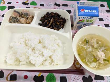 5月21日(金)の献立は「さけのごまみそ焼き、五目汁、ひじきのいため煮、ごはん、牛乳」です。