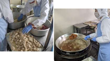 一口トンカツは、豚肉に白ワイン、塩、オールスパイスで下味をつけて、衣ををつけて揚げています。ひとつひとつ衣をつけるので手間がかかりますが、好評の献立でした。