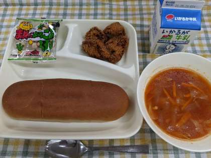 5月24日(月)の献立は「一口トンカツ、ミネストローネ、豆こんぶ、黒糖パン、牛乳」です。