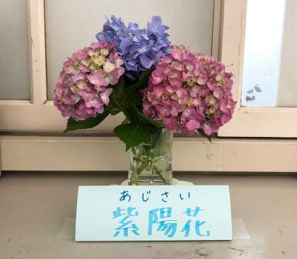 写真は、自然観察園入り口の紫陽花と保健室前に活けられた紫陽花です。