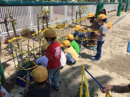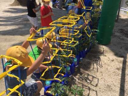 育てているプチトマトがすくすくと伸びてきました。上に伸びていくように、支柱を立てます。すでに花や小さな実ができているものもありました。たくさん赤い実ができてほしいと、たっぷり水をあげています。