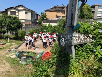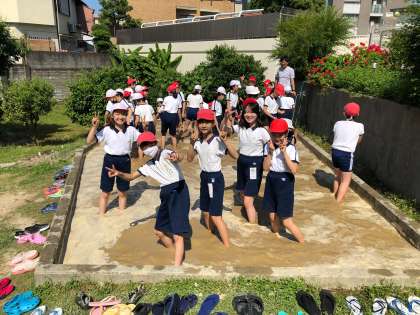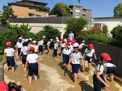 水を入れた田んぼに、裸足で入り、自分の足で耕しながら、土の感触を確かめます。
