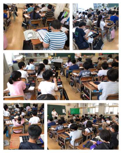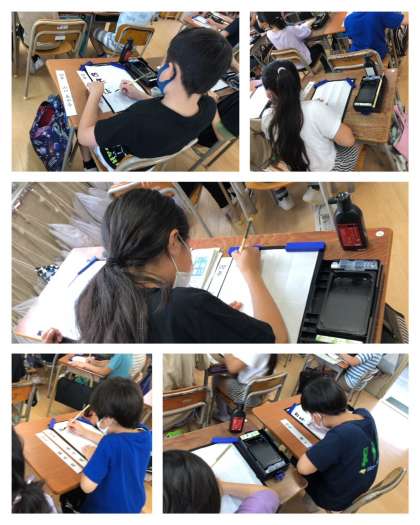 6月4日(金)5時間目、4年1組は習字で、小筆を使って自分の名前を書きます。