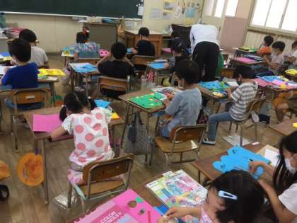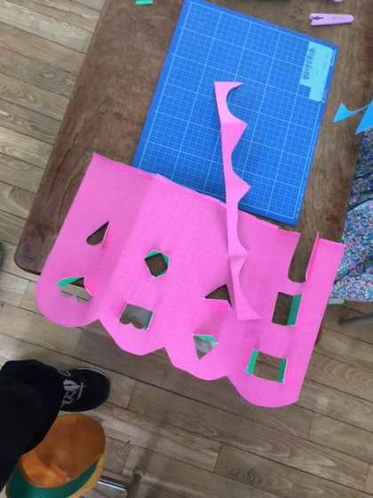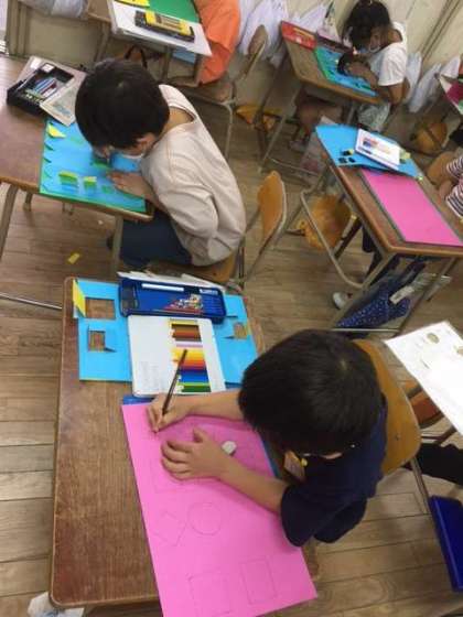 いろいろな形の窓をあけてから、窓から出てくる人や動物を描きこみました。