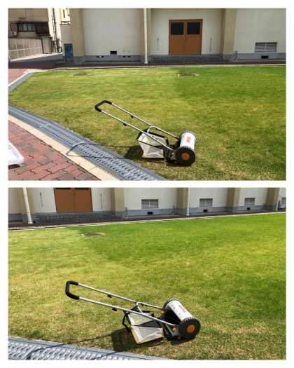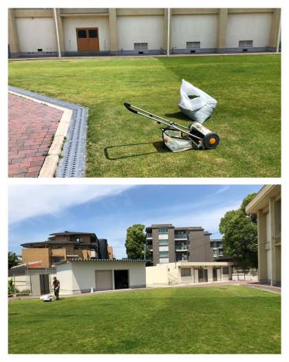 西運動場の芝生広場、梅雨の中休みを利用して芝刈りをしました。