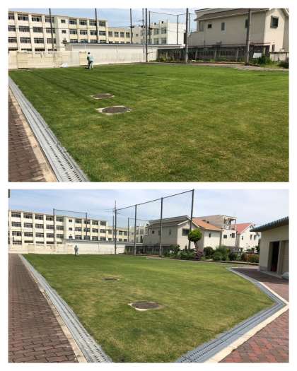 校長先生、管理作業員さん、地域緑化ボランティアのみなさんが協力して、美しい芝生広場に仕上がってきています。