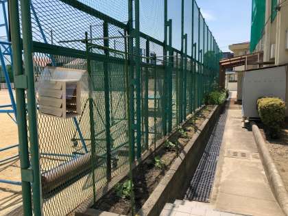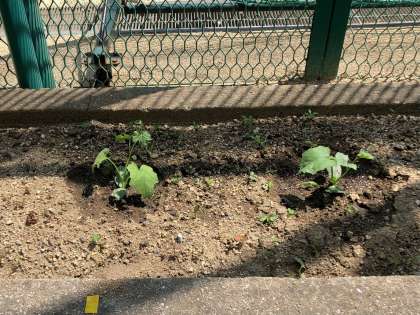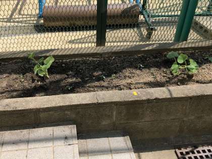 管理作業員室と給食室裏の花だんに、へちまとひょうたんを植えました。