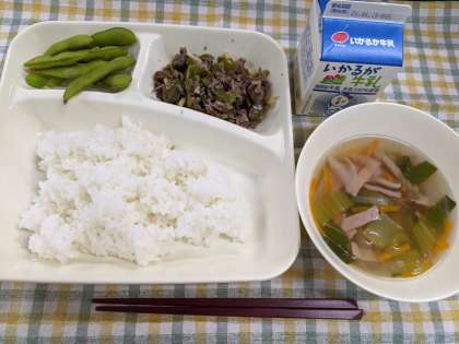 6月9日(水)の献立は「チンジャオニューロウス—、ハムと野菜の中華スープ、えだまめ、ごはん、牛乳」です。
