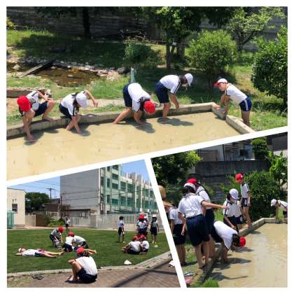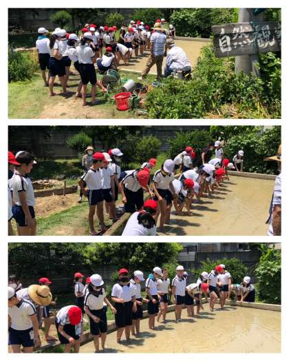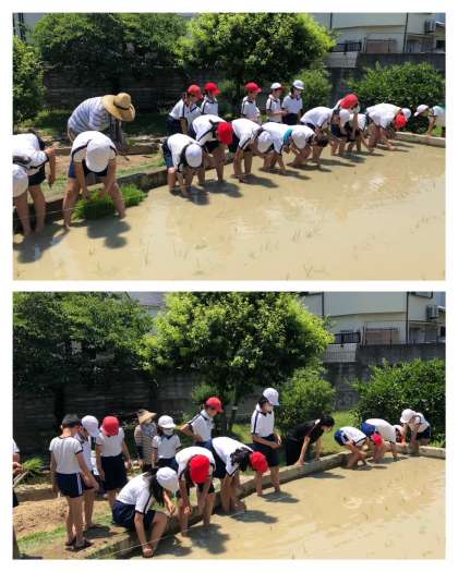お手伝いしていただいている園芸クラブの方々も段取りがわかり、手際よく田植えが進んでいます。気温も上がり、田んぼの水温も上昇しているようです。