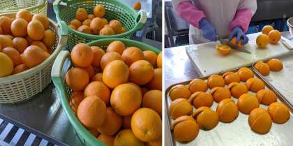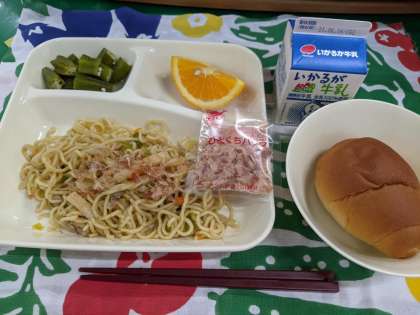 6月10日(木)の献立は「和風焼きそば、オクラの甘酢あえ、オレンジ、1/2黒糖パン、牛乳」です。