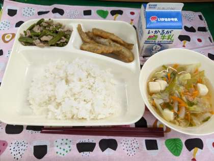 6月11日(金)の献立は「いわしてんぷら、五目汁、豚肉とさんどまめのいためもの、ごはん、牛乳」です。