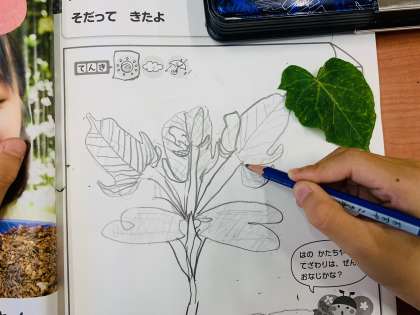 先週取り組んだアサガオの観察カードを、もう一度葉をよく見ながら描きなおしました。