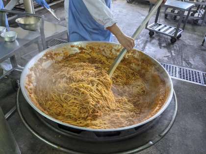 スパゲッティミートソースは釜を2つ使って350人分ずつ調理します。最後に別の釜で茹でた麺を加えて仕上げるのですが、釜からあふれそうな量のスパゲッティを混ぜるのは、なかなか大変な作業です。もたもたしているとスパゲッティが伸びてしまうので、手早く混ぜていきます。