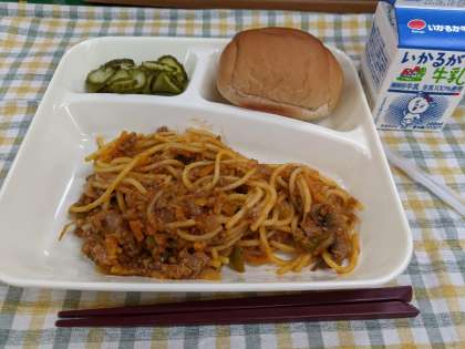 6月14日(月)の献立は「スパゲッティミートソース、きゅうりのピクルス、1/2黒糖パン、牛乳」です。