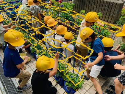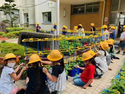 つるを支柱に巻きつけながら、子ども達はとても嬉しそうでした。