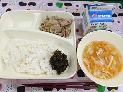 6月15日(火)の献立は「豚肉のごまみそ焼き、すまし汁、のりのつくだ煮、ごはん、牛乳」です。