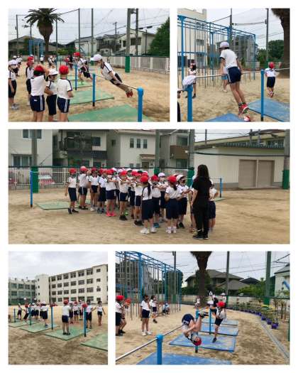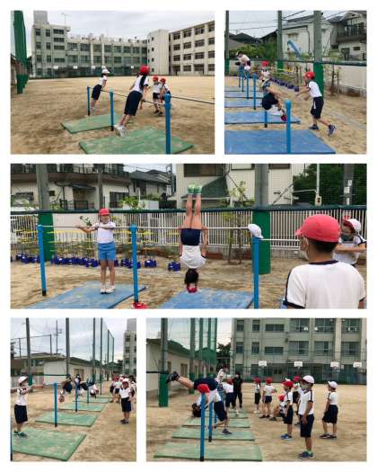 6月18日(金)3時間目、低鉄棒に取り組んでいます。