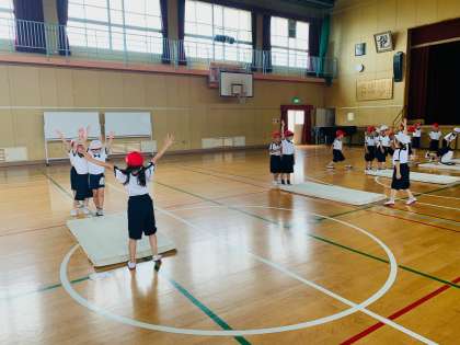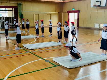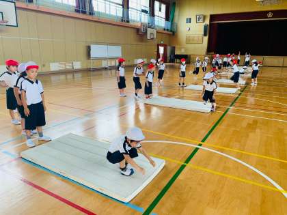安全のために、マットを降りてから次の友だちに交代の合図を送ります。