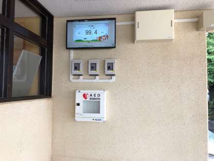 本校には、正門玄関に1台AED(自動体外式除細動器)を設置していますが、いざという時に、体育館・プール・西運動場側にも必要だとの観点から、PTAとして1台契約いたしました。