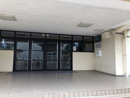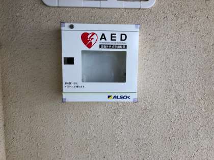 写真を見ていただくとわかりますが、体育館入り口向かって右側にBOXを設置しています。AED本体は、現在代替機を使用していますが、7月9日頃に新品が納品される予定です。