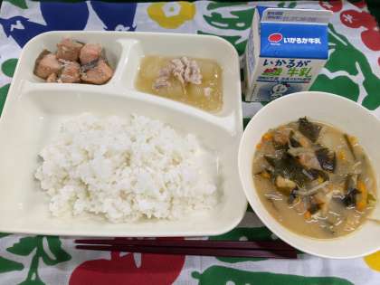 7月2日(金)の献立は「さけのつけ焼き、みそ汁、とうがんの煮もの、ごはん、牛乳」です。