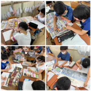 今日は、子どもたちが持ってきた身の回りの広告から、作り手の意図や目的を探しています。
