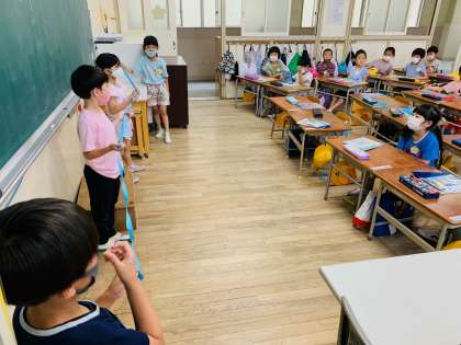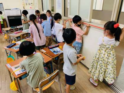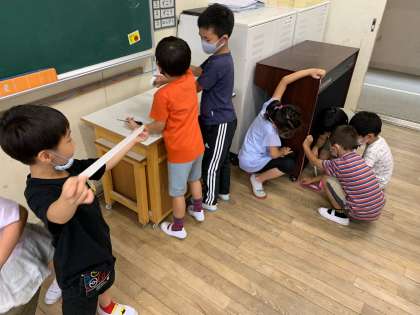 縦、横、高さ、幅などの言葉を使いながら、はかったものや場所について発表することができました。