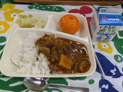 7月6日(火)の献立は「夏野菜のカレーライス、キャベツのピクルス、冷とうみかん、牛乳」です。