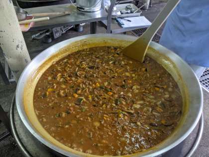 夏野菜のカレーライスには、かぼちゃ、なす、トマト、ピーマンが入っています。
