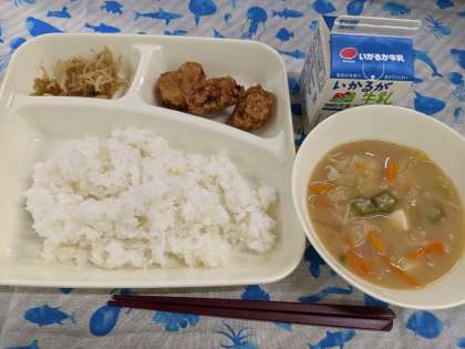 7月7日(火)の献立は「豚肉の香味あげ、みそ汁、もやしのおひたし、ごはん、牛乳」です。