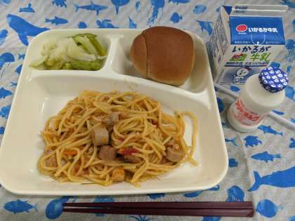 7月8日(木)の献立は「チキントマトスパゲッティ、グリーンアスパラガスとキャベツのサラダ、発酵乳、1/2黒糖パン、牛乳」です。