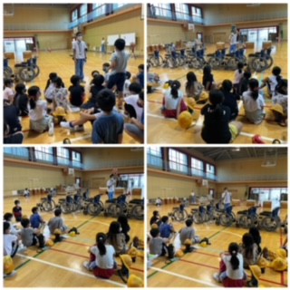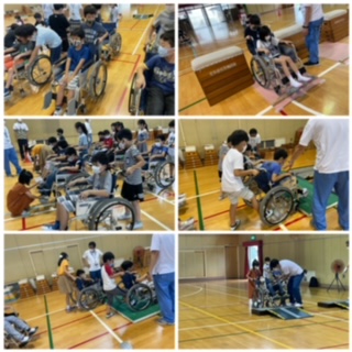 体育館内では、自分で車いすに乗り操作する体験(自走体験)と友達を車いすに乗せて介助の仕方を学ぶ体験(介助体験)をしました。