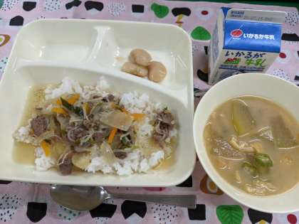 7月9日(金)の献立は「牛丼、とうがんのみそ汁、白花豆の煮もの、牛乳」です。