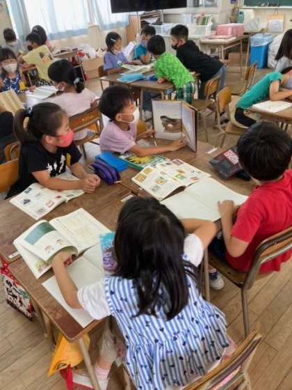 いろいろな本に触れ、動きをつけて班で発表をします。