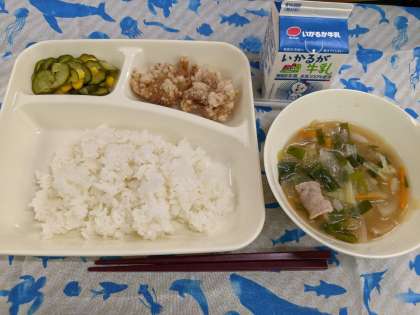 7月14日(水)の献立は「鶏肉のからあげ、中華みそスープ、きゅうりとコーンの甘酢あえ、ごはん、牛乳」です。