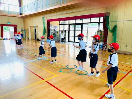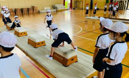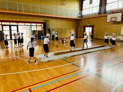 「けんぱ」のリズムで進んだり、両手で体を支えて跳び箱を跳び越したり、木箱の上でバランスを取ったり…。