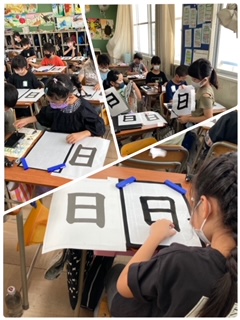 習字の活動にも慣れてきました。よい姿勢を保ち、大筆を動かし頑張っています。清書を完成させたら、半紙に絵や文字を自由にかきました。1学期の習字は終わりました。続きは2学期に、小筆を使い自分の名前も書いていきます。