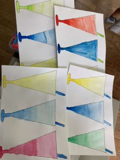 初めての絵具にドキドキしながら、きれいなカクテルを描きました。
