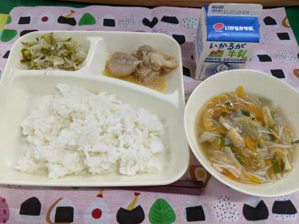 7月19日(月)の献立は「鶏肉のしょうゆマヨネーズ焼き、五目汁、切り干しだいこんのゆずの香あえ、ごはん、牛乳」です。
