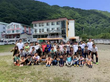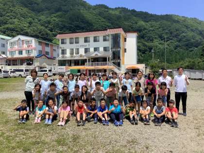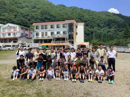 宿舎(やまとよ)をバックにクラス写真です。