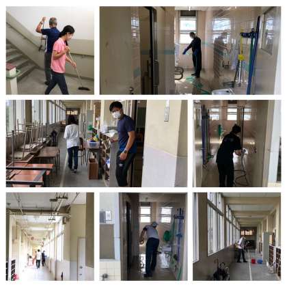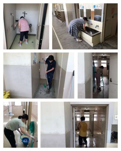 特に、北校舎がトイレ工事の影響でほこりまみれになっているので、粉塵を丁寧にふき取っています。各校舎のトイレや流しも消毒をして、きれいに洗い流しました。