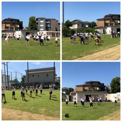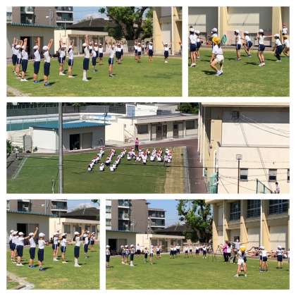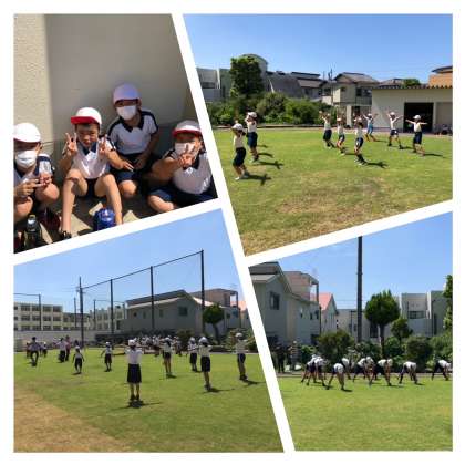 8月27日(金)2時間目、4年生は芝生広場でラジオ体操コンクールに向けてのビデオ撮影を行っています。