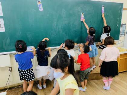 黒板以外でどこの場所に貼ることができるか、大はしゃぎで試していました♪