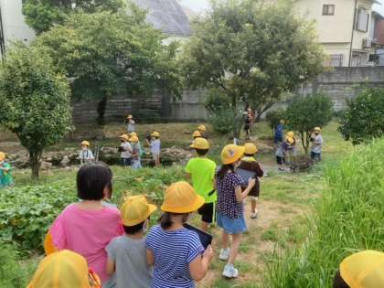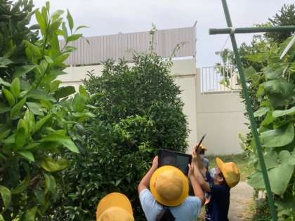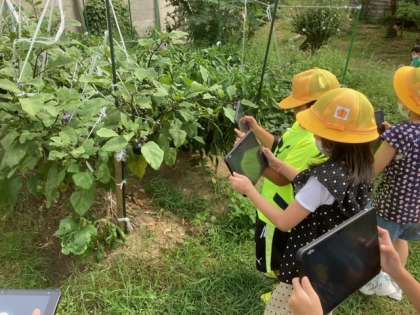 タブレットを持ち、観察園にどんな生き物がいるのか探しに行きました。どんなところにいるのか確認しながら探索します。石の下、池の周り、木の上、原っぱ、落ち葉の上などいろんなところを探しました。するとコオロギやトカゲ、アゲハチョウなどたくさんいました。 「教室で飼ってみたい」「さわると思っていたのとちがう」と、命に触れる機会になりました。