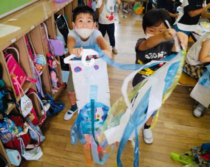 細かい飾りをたくさん貼り付けて楽しんでいる子もいれば、スズランテープをたくさん付けてひらひら揺れる様子が楽しくて喜んでいる子もいました。