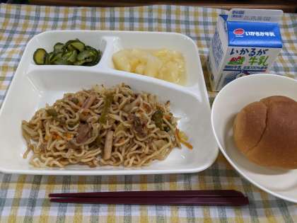 9月2日(木)の献立は「焼きそば、きゅうりのしょうがづけ、パインアップル(缶)、1/2黒糖パン、牛乳」です。