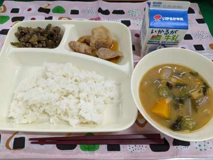 9月3日(金)の献立は「焼きとり、みそ汁、なすのそぼろいため、ごはん、牛乳」です。