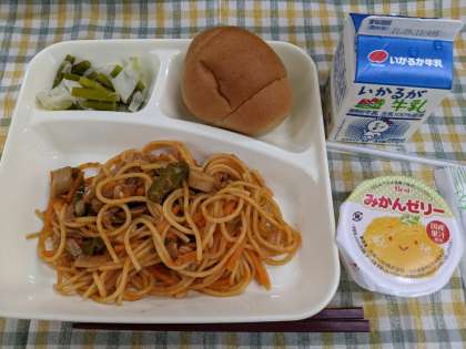 9月7日(火)の献立は「イタリアンスパゲッティ、グリーンアスパラガスとキャベツのサラダ、みかんゼリー、1/2黒糖パン、牛乳」です。