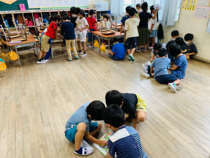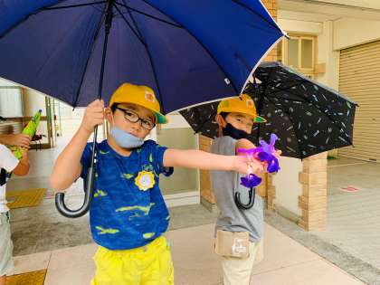 朝から雨でしたが、子ども達はかさをさしながらアサガオを摘み取り、押し花にするために乾かしました。
