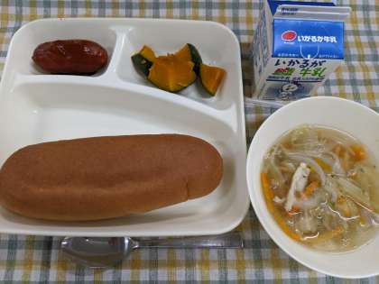 9月14日(火)の献立は「フランクフルトのケチャップソース、スープ、焼きかぼちゃ、黒糖パン、牛乳」です。